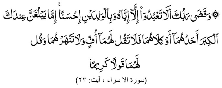 “Your lord has decreed that you workship none but him, and do good to parents. If any one of them or both of them reach old age, do not say to them “uff” and do not scold them, and add ress them with respectful words”.